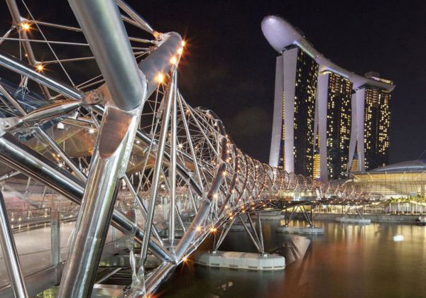 橫跨濱海灣、銜接新加坡新市區(qū)與中心商業(yè)區(qū),雙螺旋橋是Cox Architects和Architecture 61建筑事務(wù)所的一個(gè)聯(lián)合項(xiàng)目。它上面設(shè)有四個(gè)懸臂式觀景平臺(tái) ,不銹鋼鋼管呈兩條優(yōu)雅的螺旋曲線相互纏繞,讓人行橋如同蛟龍一般盤江而臥,不過獨(dú)特的外觀其實(shí)是取意于DNA的螺旋結(jié)構(gòu),寓意著生命、延續(xù)、更新和成長(zhǎng)。當(dāng)夜晚有LED燈亮起時(shí),在玻璃與不銹鋼管的折射下 ,整座橋會(huì)綻放出絢爛的美麗。