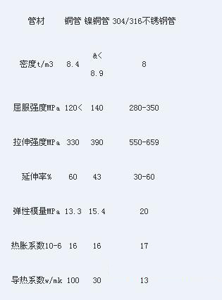 從上表可以看出:不銹鋼管的屈服強度和抗拉強度都比銅管高,不銹鋼管的使用壽命必然要比銅管長,熱脹系數比銅管低,與管板更接近,因此,不易因熱脹冷縮面損傷了管子或影響脹口。